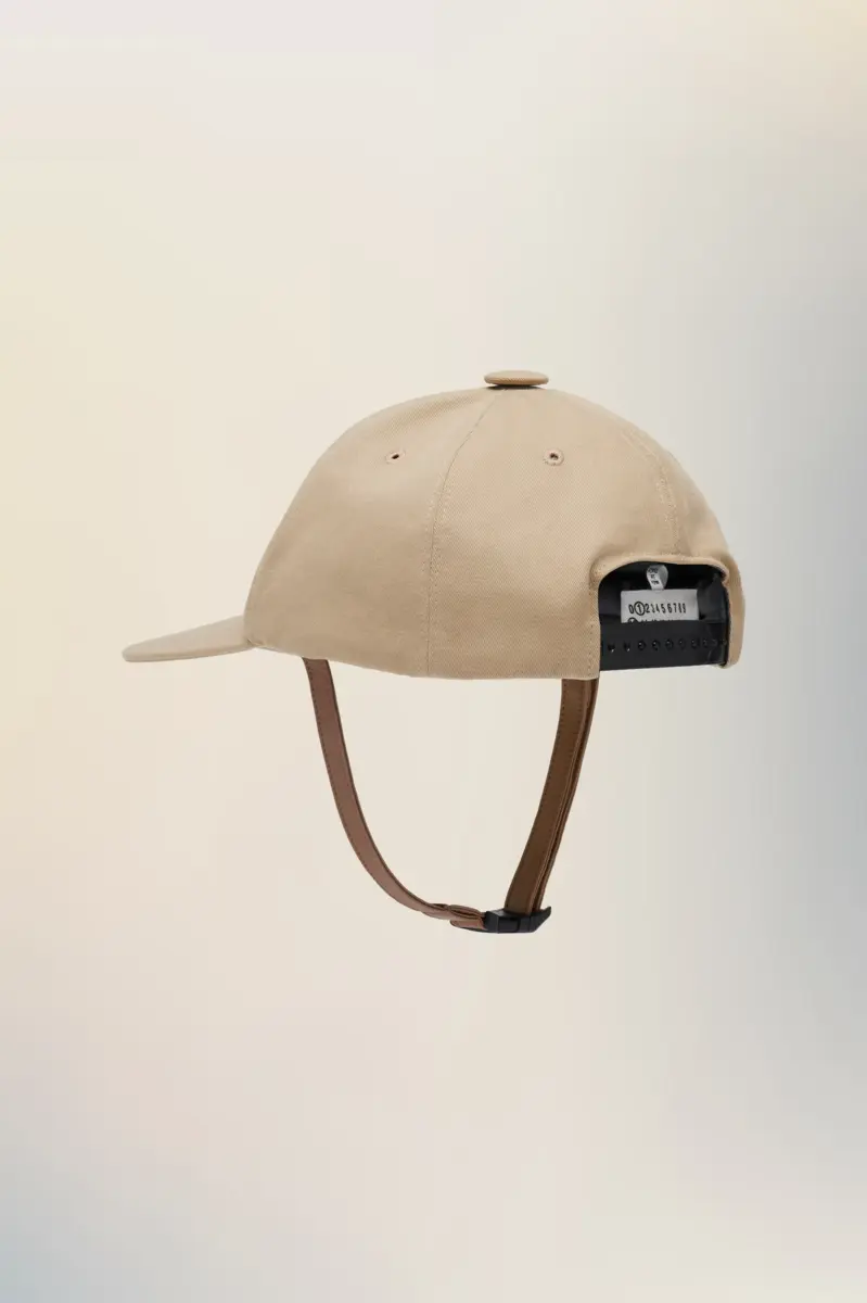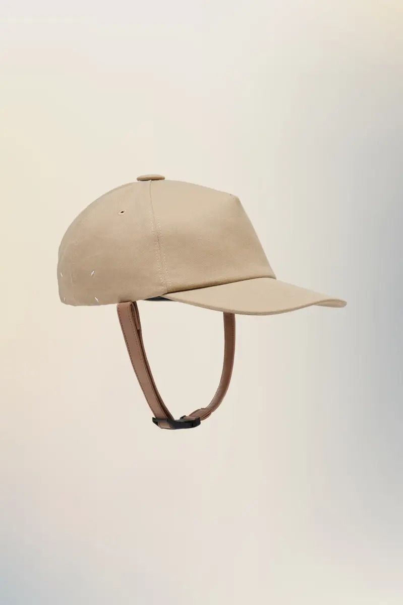 Această șapcă de călărie din bumbac distilează influențele ecvestre într-o siluetă minimală. Borul curbat și cureaua sa tonală sugerează o utilitate liniștită, în concordanță cu refacerea colecției a articolelor de bază din mediul rural. Semnătura Maison Margiela, cele patru ochiuri, apar în lateral; opusul unei etichete.