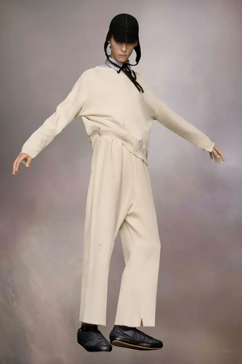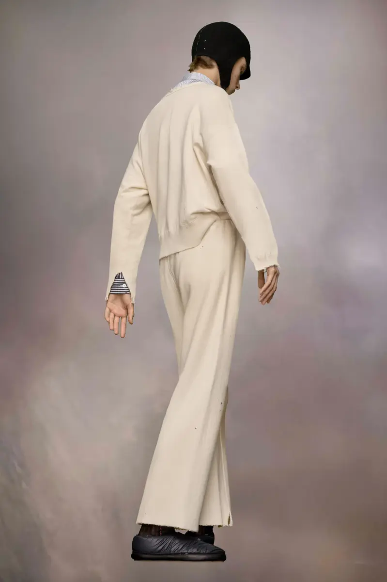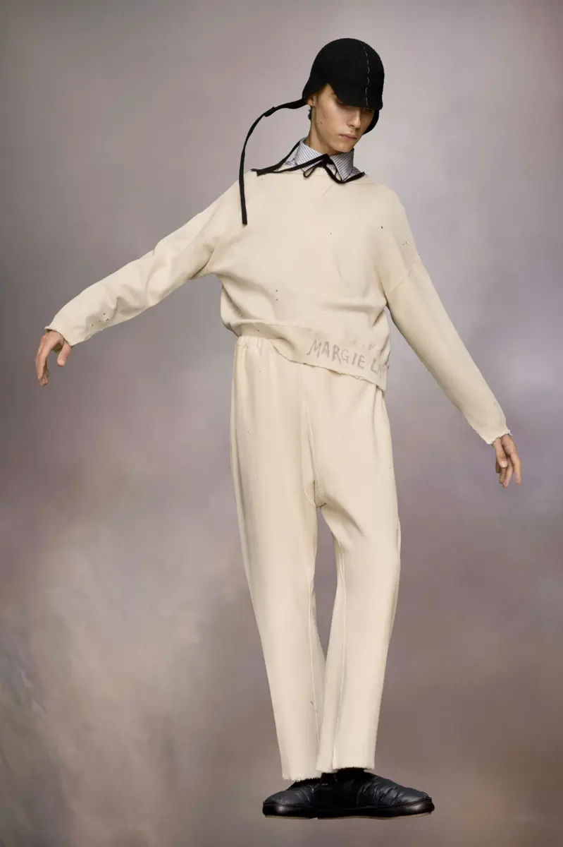 În fleece din bumbac organic, hanoracul cu gât rotund are mâneci lungi tăiate și un logo Margiela scris de mână la tiv. Marginile brute prezintă o estetică nefăcută. Semnătura Maison Margiela, cele patru ochiuri, apar în spate; opusul unei etichete.