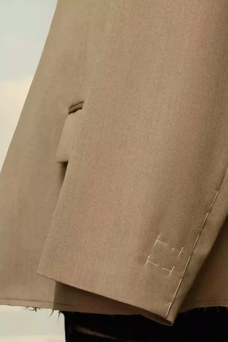 Un blazer din lână, cu guler mandarin și buzunare asimetrice. Prezintă guler contrastant, amintirea manșetelor și patru cusături albe în spate care arată mâna Maison: opusul unei etichete.