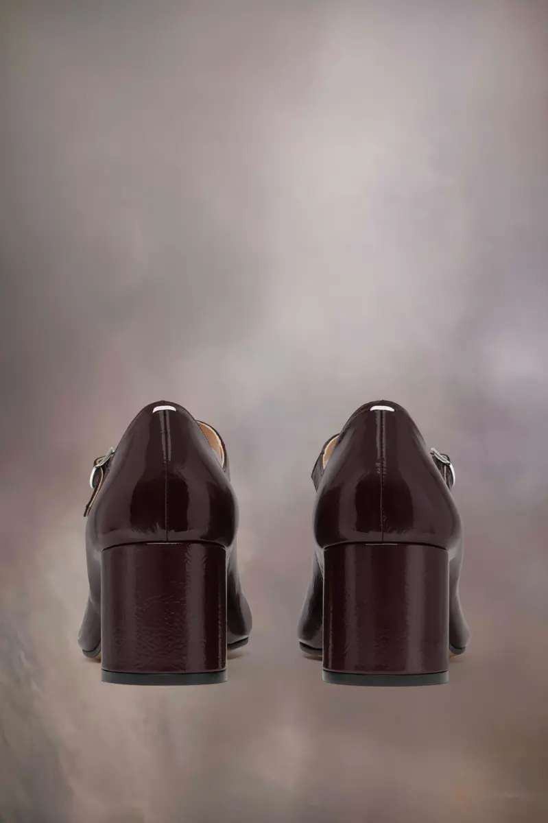 Confecționați din piele moale lacuită, cu o curea frontală reglabilă, pantofii Mary-Jane au un toc cilindric de 6 cm și un deget Tabi despicat. Forma degetului a fost inspirată de șosetul tradițional japonez din secolul al XV-lea care poartă același nume – lansat pentru colecția de debut a Maison în 1989. Este un simbol al spiritului avangardist și insubordonat al Maison și există ca un clasic de patrimoniu, explorat prin colecții. Cusătura albă semnătură a Maison Margiela apare în spate.